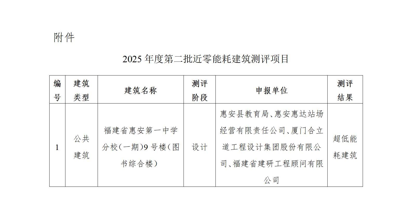 根据《近零能耗建筑技术标准》(GB/T 51350-2019)等标准和相关文件,我中心组织完成了2025年度第二批近零能耗建筑测评项目的审查工作。经审定,福建省惠安第一中学分校(一期)9号楼(图书综合楼)项目通过近零能耗建筑测评专家审查。