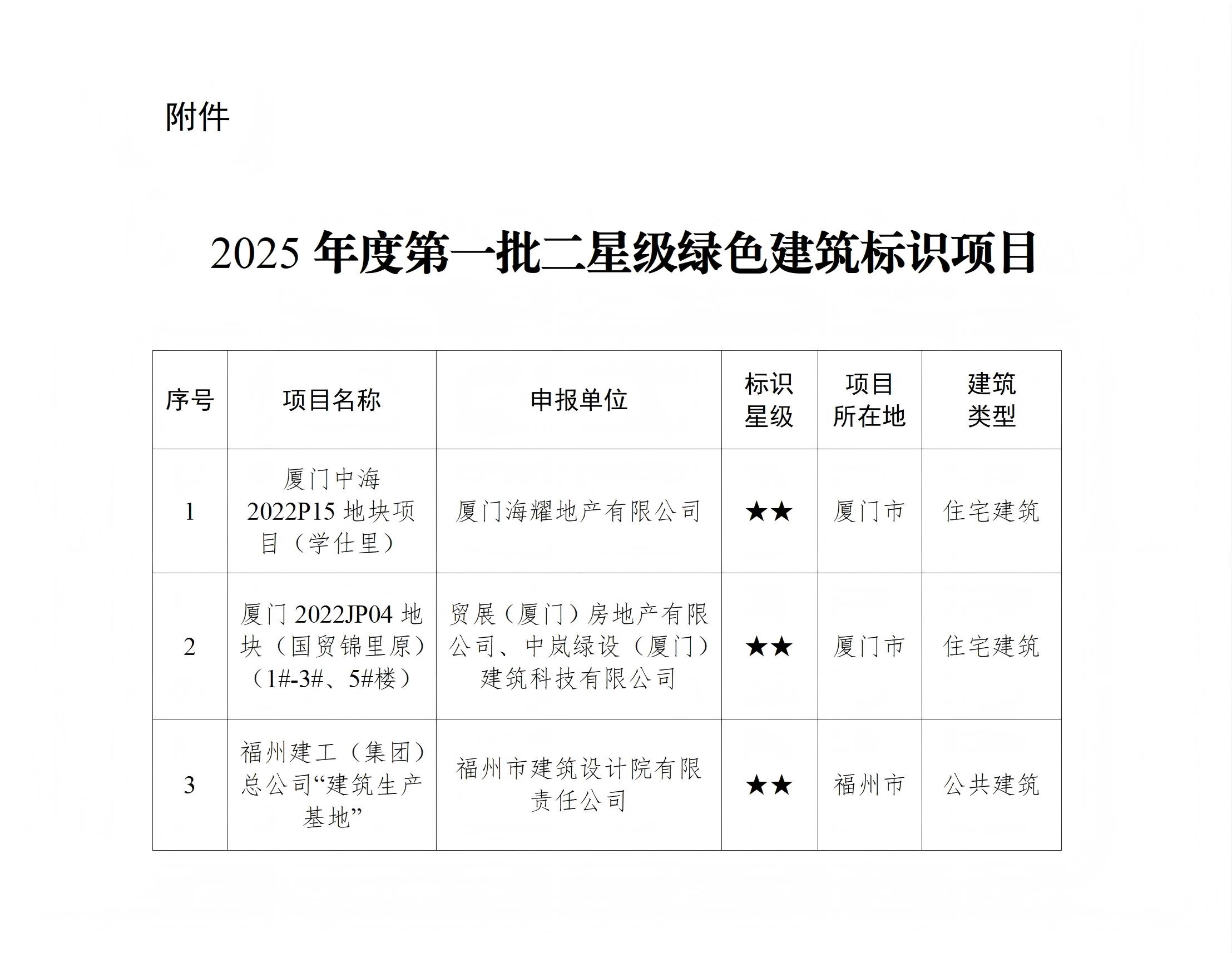 按照《绿色建筑标识管理办法》(建标规〔2021〕1号)和《福建省绿色建筑标识管理实施细则》(闽建〔2022〕7号)有关规定,省住建厅组织开展了2025年度第一批二星级绿色建筑标识项目认定工作。经项目单位申报、项目所在设区市住房和城乡建设部门推荐、省住建厅组织专家评审并向社会公示,确定厦门中海2022P15地块项目(学仕里)、厦门2022JP04地块(国贸锦里原)(1#-3#、5#楼)、福州建工(集团)总公司“建筑生产基地”3个项目为二星级绿色建筑标识项目,现予公布。