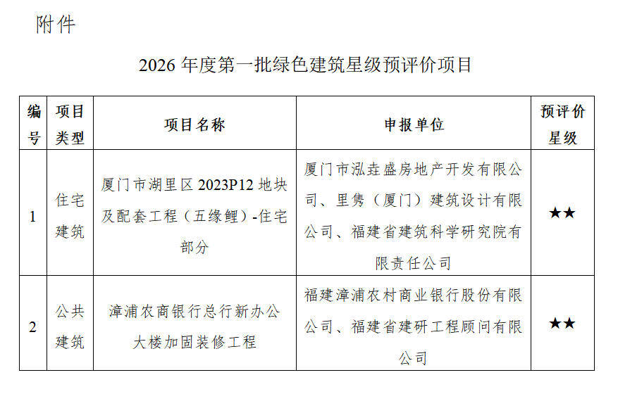 根据《住房和城乡建设部关于印发绿色建筑标识管理办法的通知》(建标规〔2021〕1号)、《绿色建筑评价标准》(GB/T 50378-2019)等文件和相关标准,我中心组织完成了2026年度第一批绿色建筑星级预评价项目的评价工作。经审定,厦门市湖里区2023P12地块及配套工程(五缘鲤)-住宅部分、漳浦农商银行总行新办公大楼加固装修工程项目通过绿色建筑星级预评价。